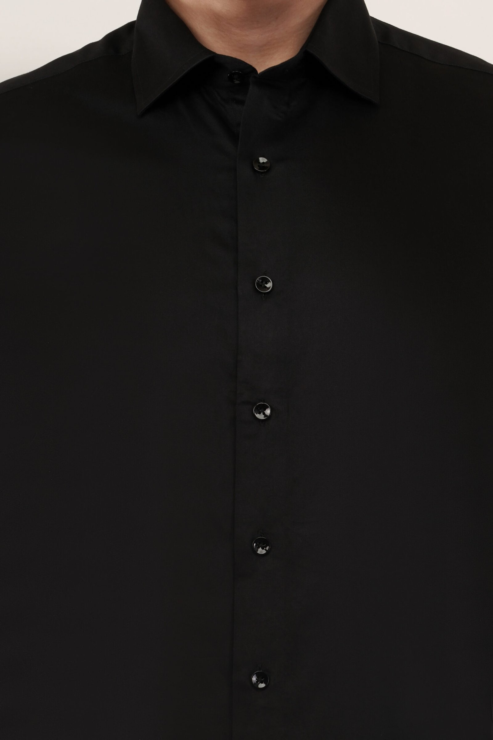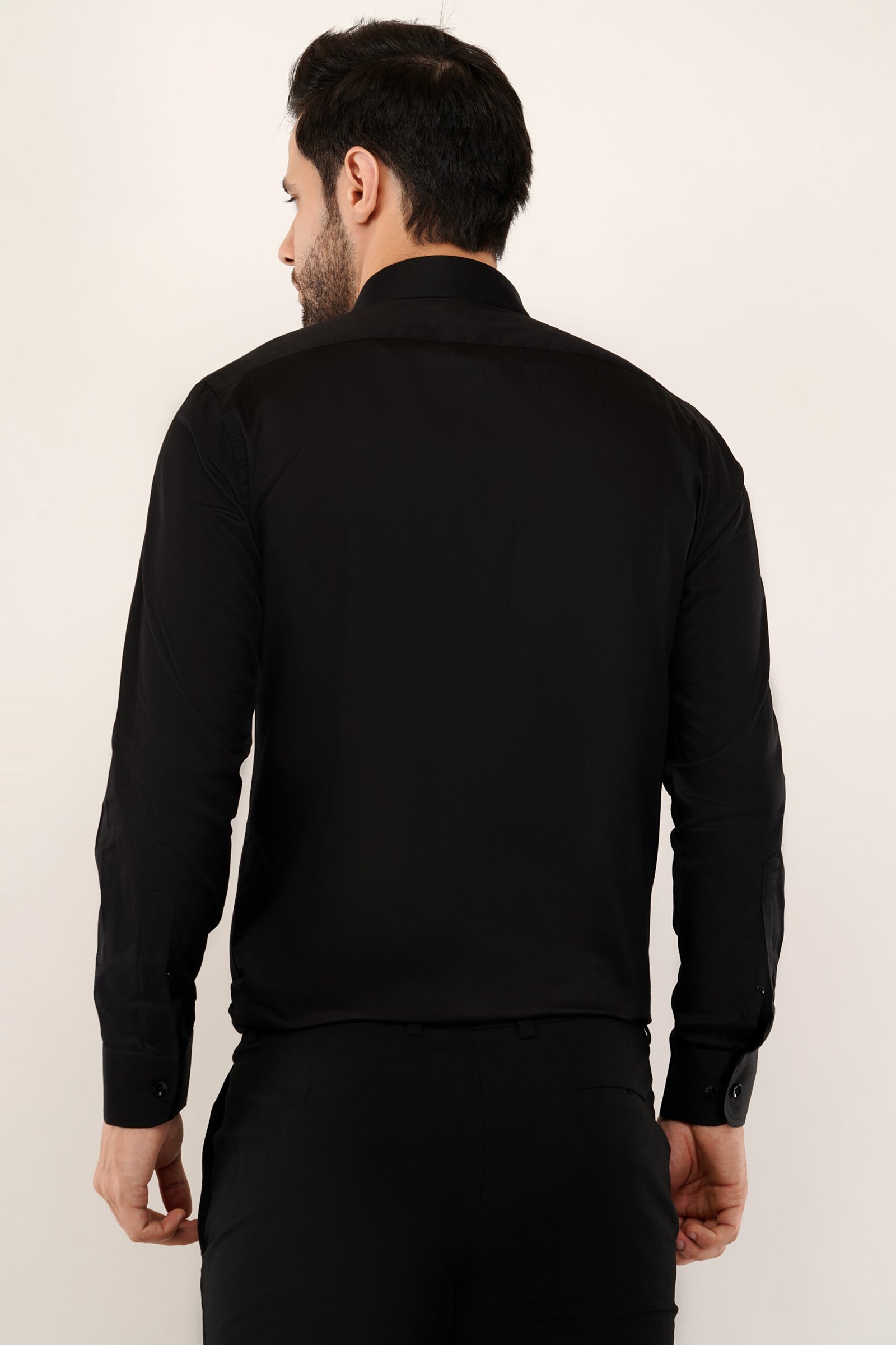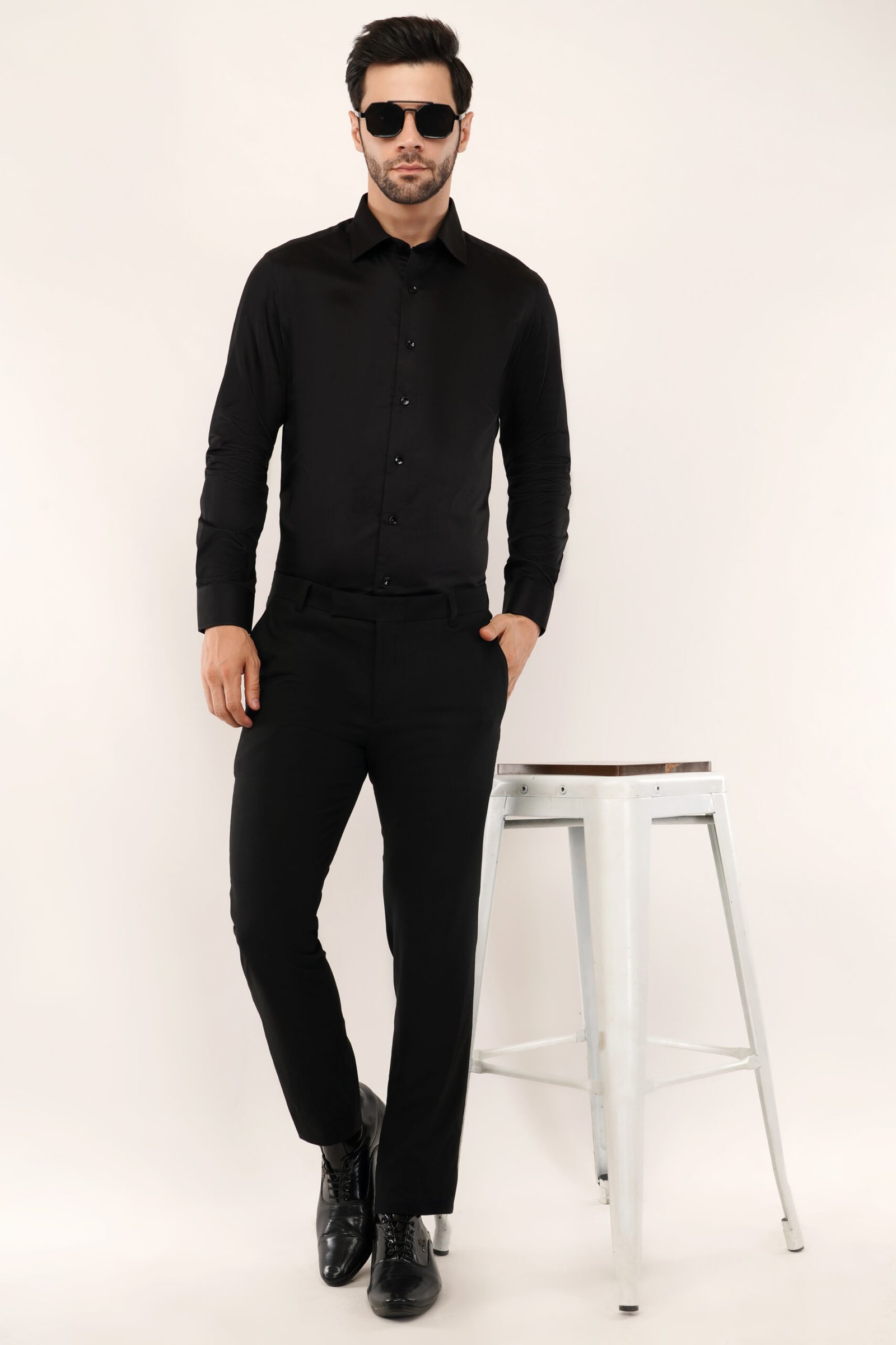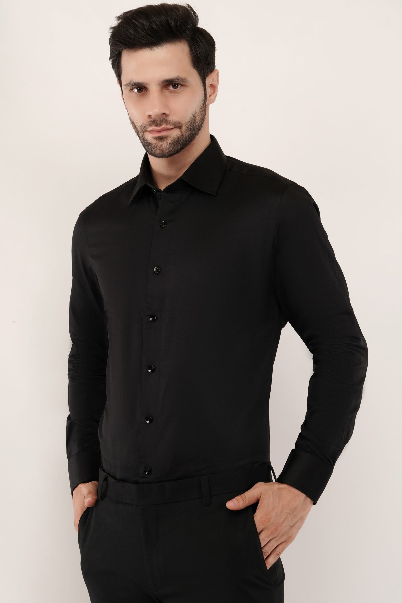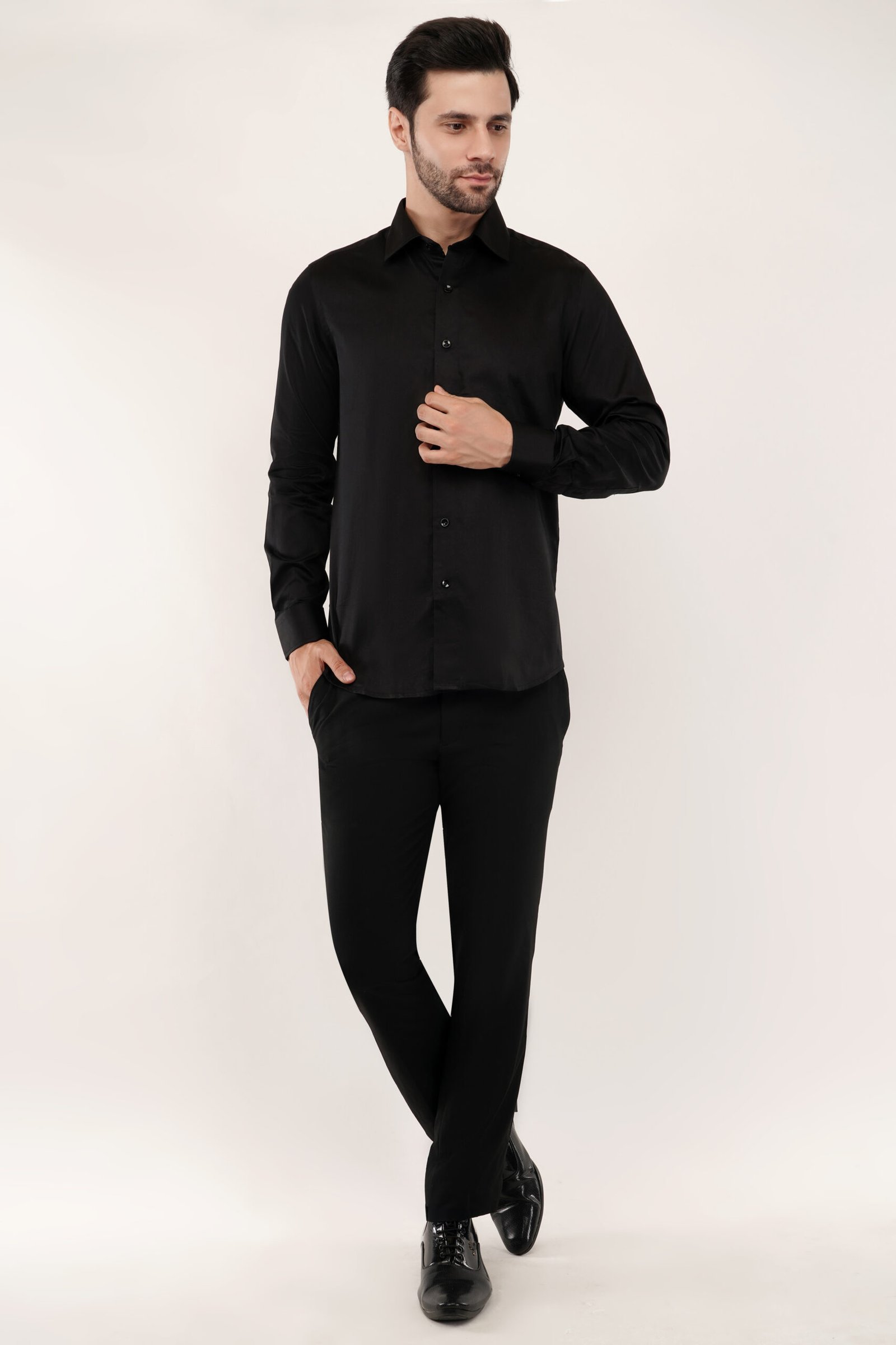 Model wearing a sleek black shirt, showcasing a modern fit and premium cotton fabric for men. Crownberry Black Shirt