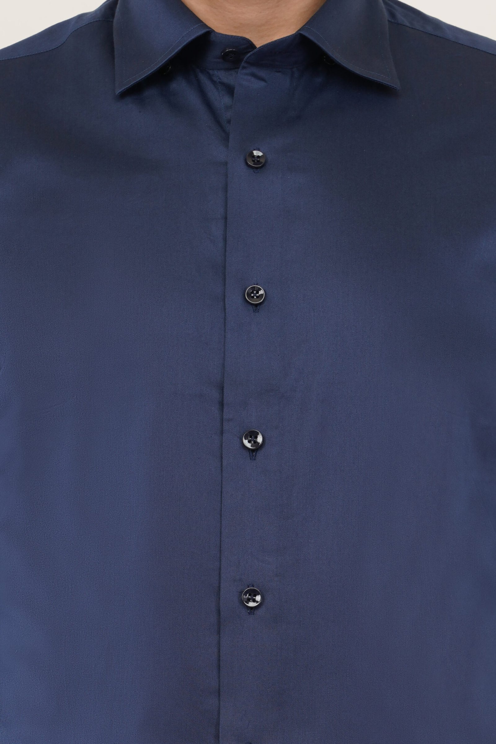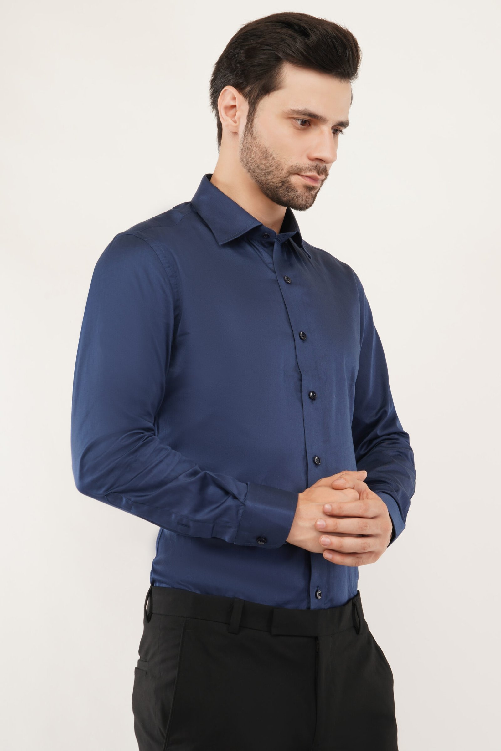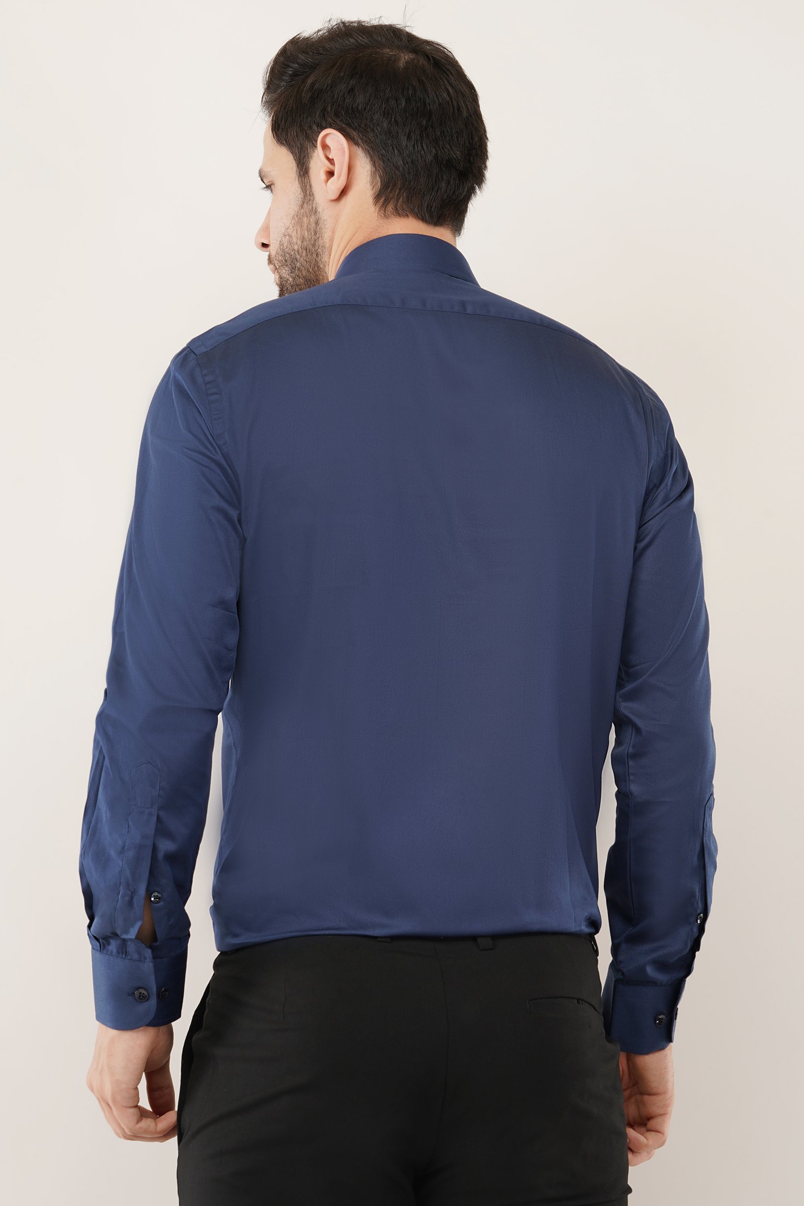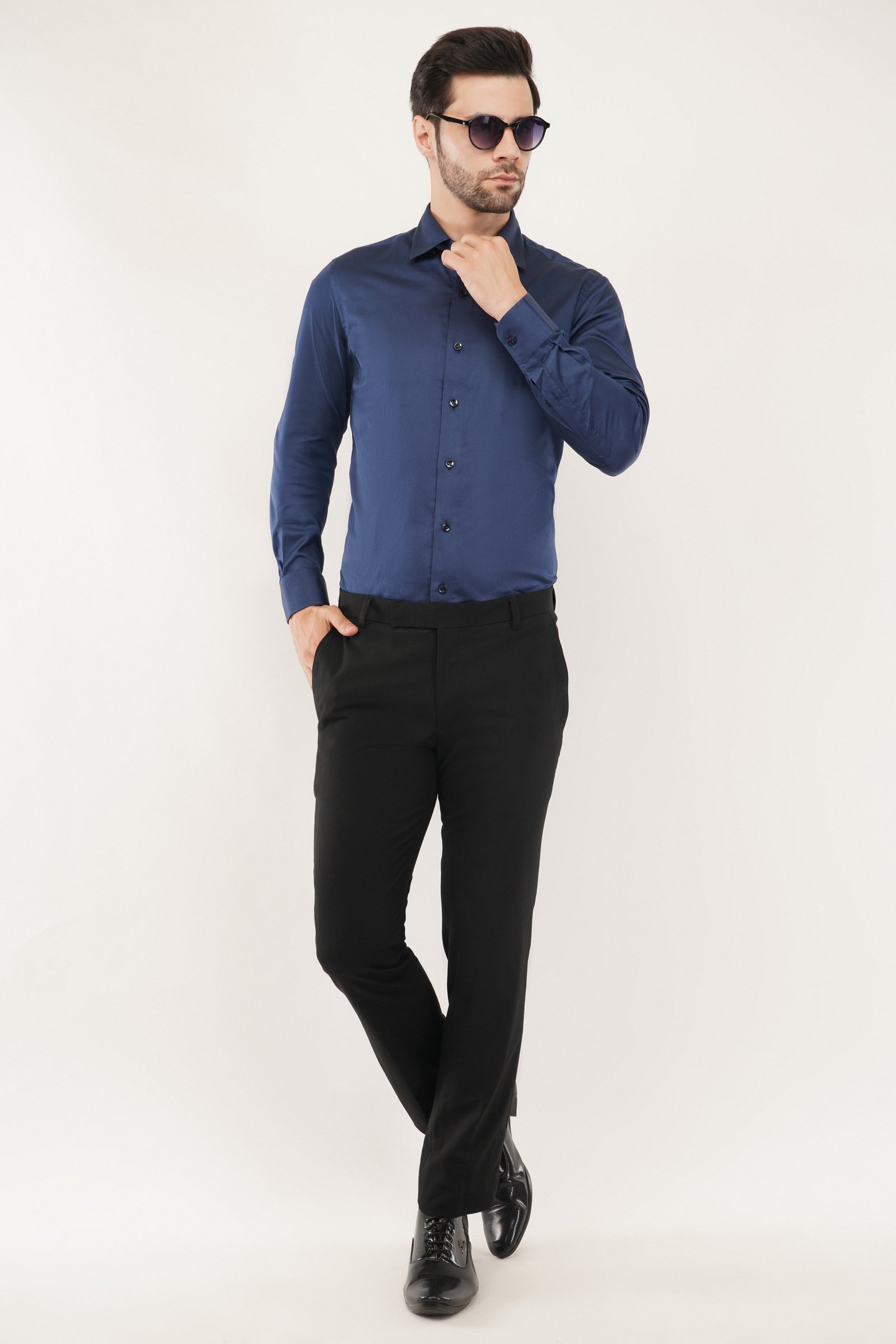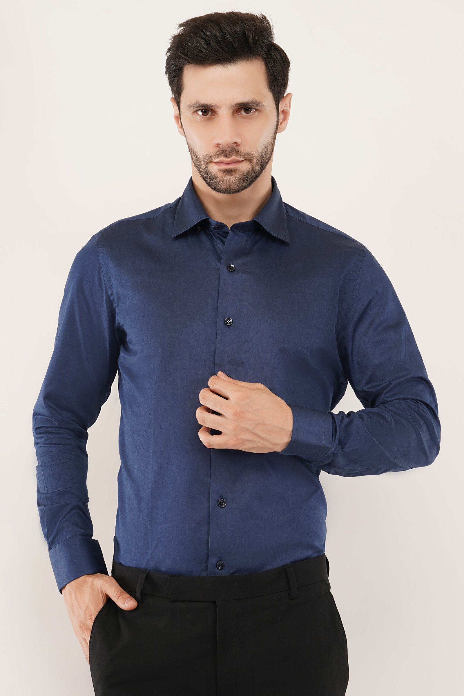Model showcasing a navy blue shirt, highlighting its stylish design and perfect fit for modern men. Crownberry Navy Blue Shirt