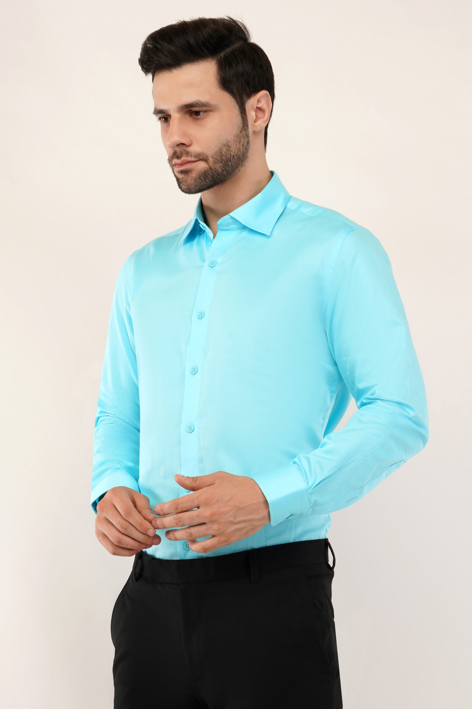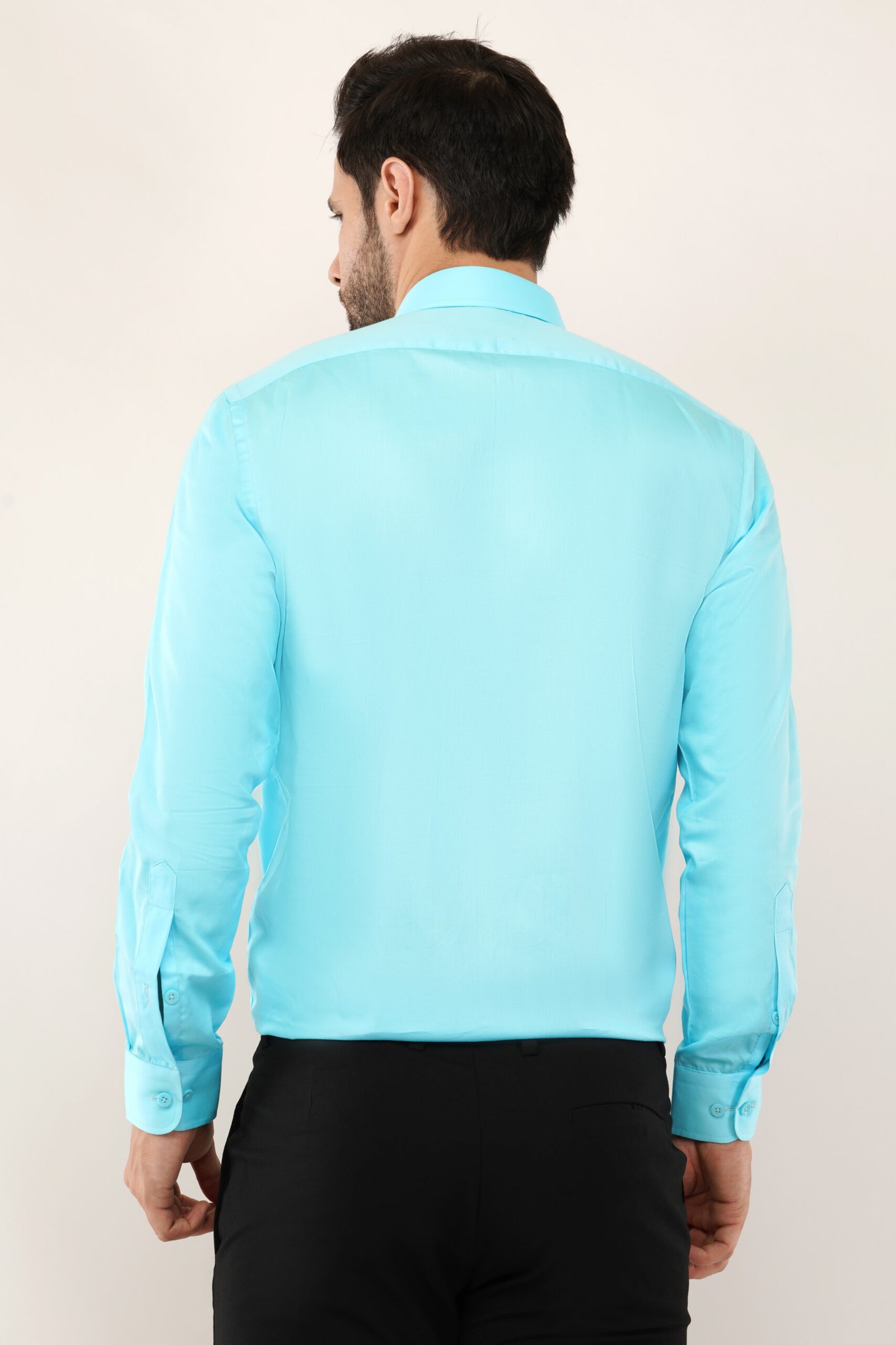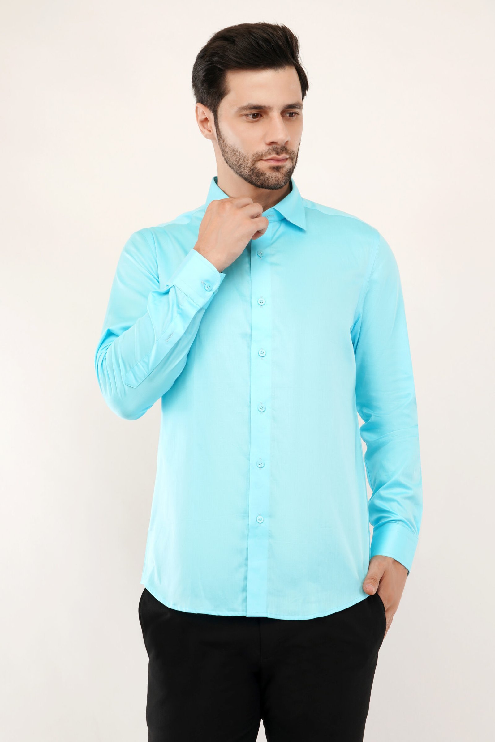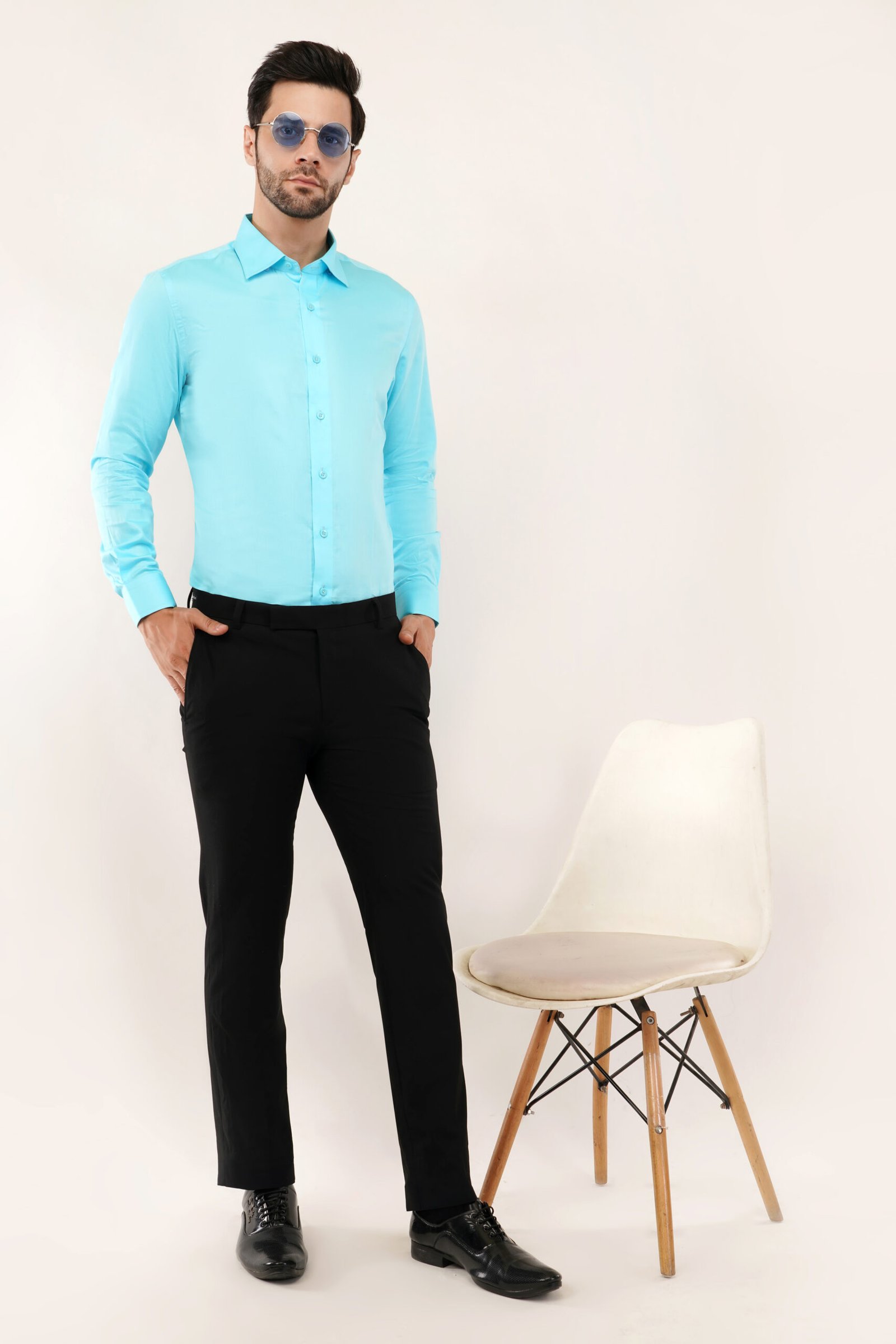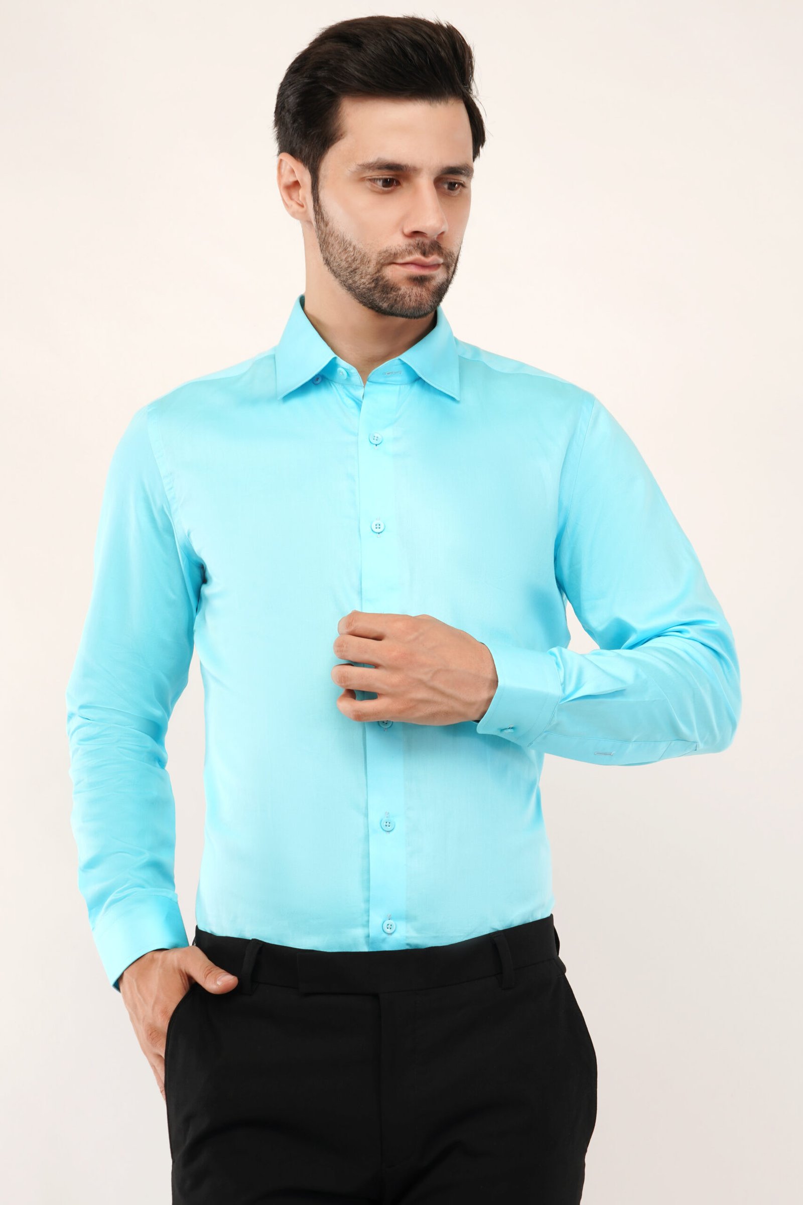 Model wearing light blue shirt for men, showcasing modern fit and stylish design Crownberry Cyan Shirt